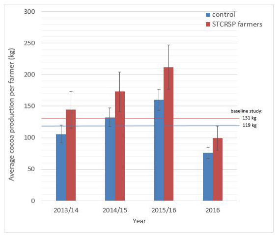 In 2014, a baseline study was conducted in Lofa County to measure key indicators in the research and non-research communities at the household level. Furthermore, the 2016 survey was conducted independently of the baseline survey, with a different questionnaire and sampling strategy but vital indicators where possible. At baseline (February 2014), the average cocoa production (kg per farmer) for the research and non-research communities was estimated at 131.2kg and 119.5kg, respectively. Over the following seasons, the average cocoa production per farmer (estimates based on farmers' recall) increased. In the 2014/15 and 2015/16 seasons, STCSP farmers produced significantly more cocoa than baseline farmers (Figure 2). The same conclusion was reached for nonSTCRSP farmers, with the certainty that this was due to the STCRSP intervention. Because this was measured in the middle of the season, the production for 2016/17 is significantly lower. STCRSP farmers, on the other hand, had similar revenues in the 2013/14 and 2014/15 seasons compared to the baseline study, but significantly higher revenues in the 2015/16 season compared to the baseline study. Cocoa revenues for non-STCRSP farmers were significantly lower in the 2013/14 and 2014/15 seasons than in the baseline study. Cocoa revenues in 2015/16, on the other hand, were comparable to payments measured at baseline (Figure 3). There has been no improvement in terms of pests or input use. According to the baseline study, 95 % of non-project farmers lacked access to extension services. In 2016, 73 % of non-STCRSP farmers lacked access to extension services. It is possible that the difference in access between 2014 and 2016 is due to a different sampling strategy. There was no discernible difference in project beneficiaries' access to extension.