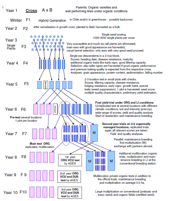 Figure 2: Breeding scheme for organic winter wheat as mainly performed by Saatzucht Donau (modified after [12]); OA= Organic Agriculture, VCU= Value of Cultivation and Use, DUS= Distinctness, Uniform and Stability, AGES=National Austria cultivar catalogue, LI= Low input |