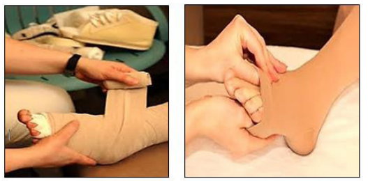 | Figure 8: Special elastic and non-stretched bandages are applied on the lymphedematous area including toes and fingers to prevent expansion of fluid. This action may be reinforced with the use of full length elastic stockings, applied above the bandages. |