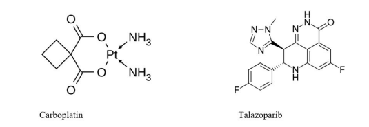Poly (ADP-ribose) polymerases (PARPs) are the enzymes found to be involved in several aspects of cellular response to various forms of damage. The most abundant PARP-1 and PARP-2 play a central role in DNA damage repair, and treated as one of the important therapeutic targets for cancer treatment. It is presumed that inhibition of PARP activity sensitizes the cancerous cells to chemotherapy and radiation leading to effective outcome [83]. Development in understanding the TNBC heterogeneity is due to the disclosure of a subgroup of sporadic TNBC, which essentially shares the homologous repair deficiency characteristic with BRCA1/2-mutated breast cancer [84]. Therefore, combinational drug therapies are being proposed by integrating the DNAtargeting platinum drug carboplatin or PARP inhibitors to standard chemotherapy [85]. The PARP enzyme helps repair the DNA single-strand breaks while the BRCA1/BRCA2 genes, encoding tumor-suppressor proteins, are involved in the repair of DNA double-strand breaks via homologous recombination. Promising clinical activities have been seen by using PARP inhibitors in patients with germ line BRCA1/BRCA2 mutation (gBRCA+), probably by synthetic lethality that arise from unresolved DNA damage and also by replication arrest triggered by physical hindrance of DNA replication forks [86]. Talazoparib is currently under phase III trial (NCT01945775) and has shown utmost preclinical efficacy due to strong binding with DNA utilizing trapping PARP–DNA complexes [86]. It has proved to have promising antineoplastic activities in advanced gBRCA+ BC as a single agent [87] (Figure 10).