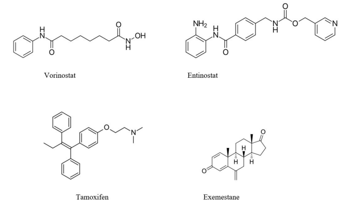 In ER+ patients, histone deacetylation-mediated loss of ER expression results in hormonal resistance, which may be reversed by histone deacetylase (HDAC) inhibitors. These inhibitors upregulated the expression of ERα and aromatase and inhibit growth factor signalling pathways [55]. Both vorinostat and entinostat are used as second-line treatment for HR-positive breast cancer, and these show significant anticancer activity in combination with tamoxifen and exemestane respectively as compared to tamoxifen/exemestane monotherapy56 (Figure 4).