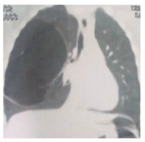 | Figure 2: Chest CT scan, coronal section, hypodense image involving the right upper lobe |