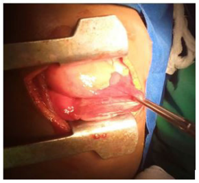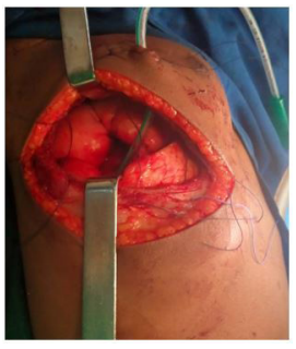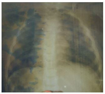 This was an 11-month-old infant, male, first of his siblings and born by caesarean section who was referred to us for assessment and management of mild respiratory distress. In this history there is a notion of fetal pulmonary cyst discovered during obstetrical ultrasounds and repetitive episodes of cough, rhinorrhea and fever attributed to repetitive pneumopathies followed regularly. On the other hand, small attacks of dyspnea associated with cough that occurred intermittently since birth were treated medically. Elsewhere, the interrogation did not reveal any notion of malformation in the family. On admission, the infant presented with mild respiratory distress with a respiratory rate of 28 cycles per minute, a room air saturation of 92%, a pulse rate of 100 beats per minute, a good general condition with a weight of 8.9 kg. Physical examination revealed thoracic asymmetry without a draw. A tympanum of the right hemothorax was found on percussion associated with a homolateral decrease in vesicular murmurs. The chest X-ray showed a hyperclar image (Figure 1) and the thoracic CT scan that was performed to better understand the cause of this hyper clarity noted a very large aerial cavity filling the right lung thus concluding to an image in favor of congenital giant emphysema occupying the right upper lobe (Figures 2). A multidisciplinary analysis then decided on a right upper lobectomy. During the procedure, the emphysema was localized in the lower segment of the upper lobe. Thus, a segmental congenital emphysema was retained as a positive diagnosis. A bullectomy and thoracic drainage were performed (Figures 3 and 4). The postoperative course was simple. The radiological control was done at Day (D)1 post-operatively (PO), (Figure 5), then at D8PO and the drain was removed at D9PO. Respiratory physiotherapy was performed as soon as the chest tube was removed in the outpatient clinic, with a good clinical and radiological evolution (Figure 6).