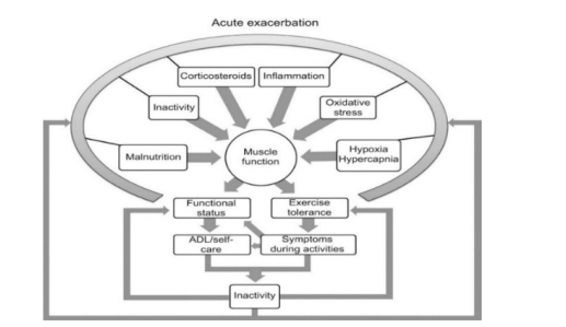In addition to pulmonary changes and respiratory impairments, patients diagnosed with COPD also undergo systemic morphological and biomechanical alterations leading to modified muscle morphology, particularly affecting strength, and physiology, especially in the lower limbs [6]. Bicxhemical changes primarily result from long-term steroid use and Chronic Systemic Inflammatory Syndrome (CSIS) (7) , impacting the patient's physical capacity for activity, as depicted in Figures 1 and 2. Such changes result in more energy expenditure during activities of daily living (ADLs), resulting in short. ness of breath (SOB) following minimal exercises.