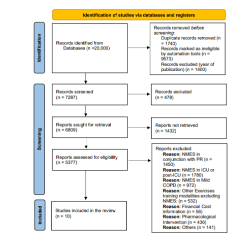Study Selection and Quality AppraisalA total of 10 articles were reviewed. Table 3 summarises these articles, discussing the effects of NMES as an adjunct to chest and mobility exercises, breathing exercises, and breathing and chest mobility exercises during the acute phase.