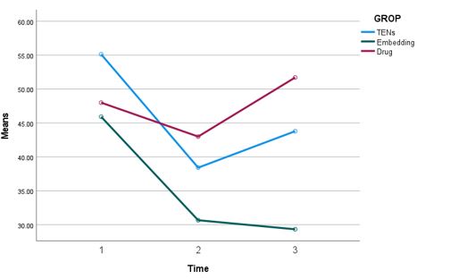 Results: Significant changes were observed in pain and QoL scores over the treatment course in both TEA and TENS groups (P < 0.001), while no significant changes were found in the classical treatment group (P=0.68). Additionally, both TENS and TEA therapies had significant impacts on IL-6 levels over time, whereas classical treatment did not induce any significant changes.