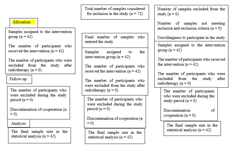The present research is an experimental study of a randomized controlled trial (RCT) type. The study population consisted of all individuals with knee osteoarthritis referring to the outpatient clinics at hospitals in the city of Sabzevar. In this study, 72 people from the study population who had the characteristics of the research units were regarded as the research sample. Sample size was calculated based on previous studies [5] using G*Power software. Considering a 95% confidence level, a test power of 85%, and a large effect size of 0.4, a total sample size of 72 participants (24 participants per group) was determined for this study (α = 5%, confidence level (1- α) = 95%, test power (1-β) = 15%, effect size = 4.0). Consequently, a sample size of 24 participants per group was determined, considering a 10% dropout rate. These patients were diagnosed with osteoarthritis based on a Kellgren-Lawrence score of 2-3 and a Visual Analogue Scale (VAS) pain score of higher than/equal to 4 to lower than/equal to 7 (indicating moderate pain level).