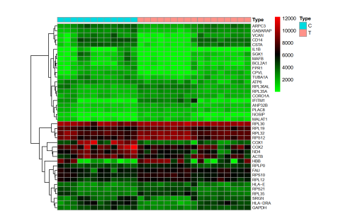 | Note: The left side is the control group, and the right side is the experimental group. Red indicates high gene expression. black intermediate expresion, and green low expression |