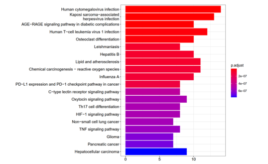 | The top 20 of KEGG pathway analysis were drawn into a bar chart (Figure 6), which is visible |