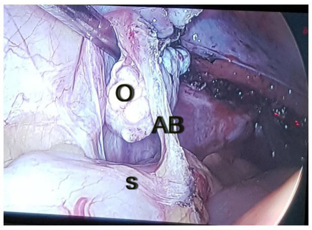 | Figure 1: Shows a remnant adhesion band (AB) between the left ovary(O) and the sigmoid colon(S) following VH, and was detected during PHCL |